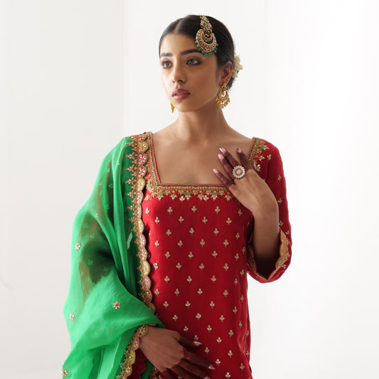 Mint Red Silk Chanderi Sharara Set