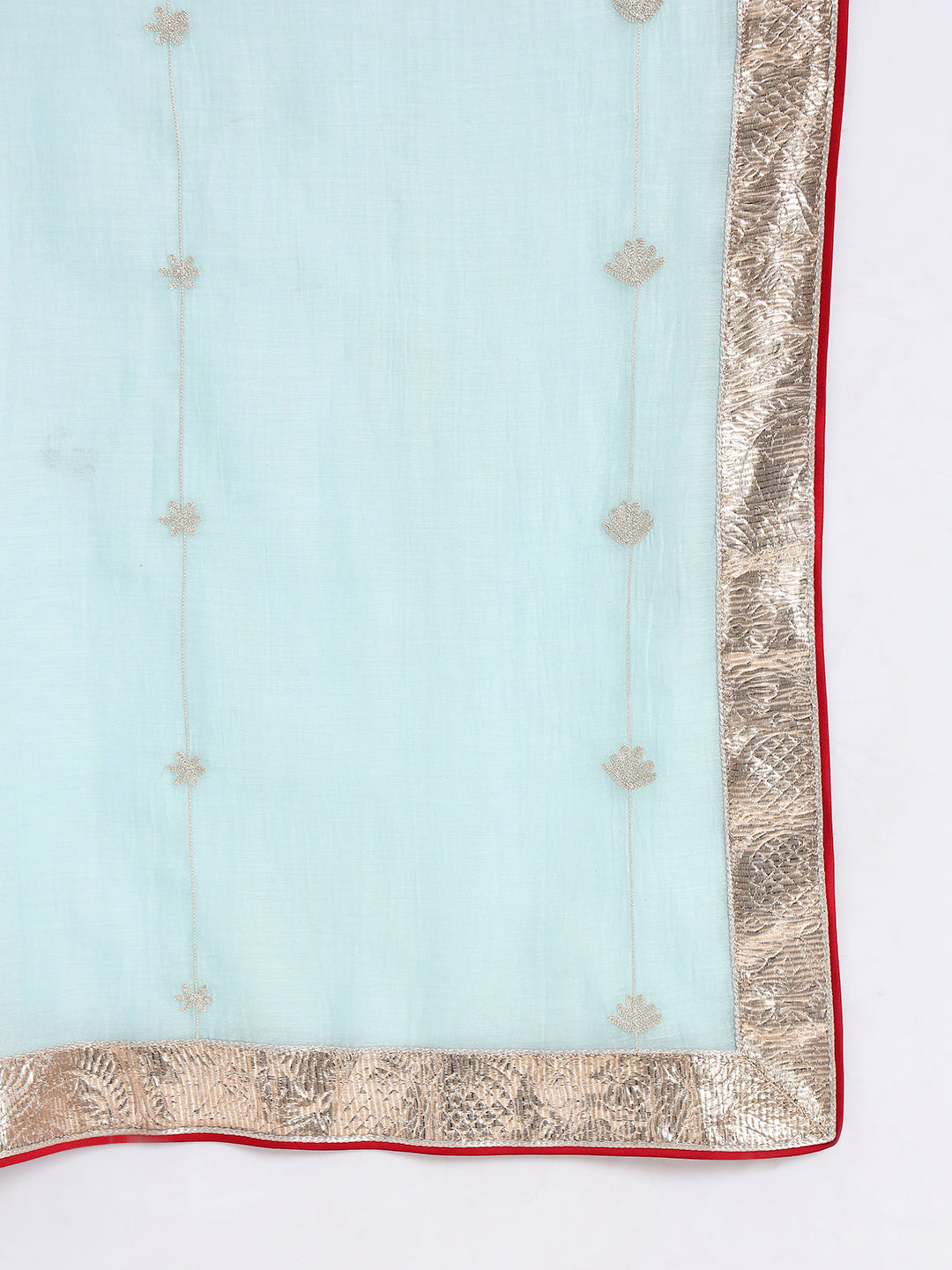 The Aqua Grace Mal Chanderi Sharara Set is an ode to understated elegance and traditional artistry, blending serene hues with intricate craftsmanship. Tailored from airy mal chanderi fabric, the ensemble flows with effortless grace, its soft aqua tone enhanced by a subtle sheen that exudes sophistication. The short kurta features delicate aari embroidery complemented by shimmering lampi gotta detailing along the neckline and borders, adding a touch of regal refinement. Paired with a voluminous sharara that mirrors the same ornate finish, the silhouette strikes a harmonious balance between comfort and grandeur. The look is completed with a matching dupatta, adorned with detailed gotta borders and a fine red piping that lends a hint of contrast and depth.