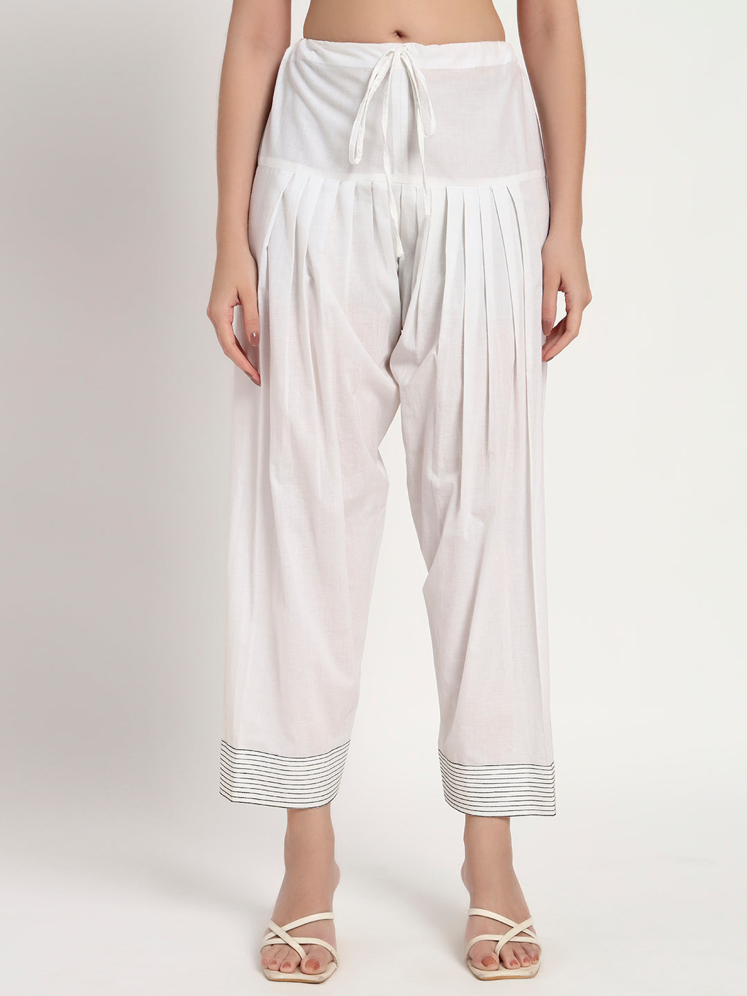 - Kurta: Notch neckline, full sleeves, scalloped/embroidered borders