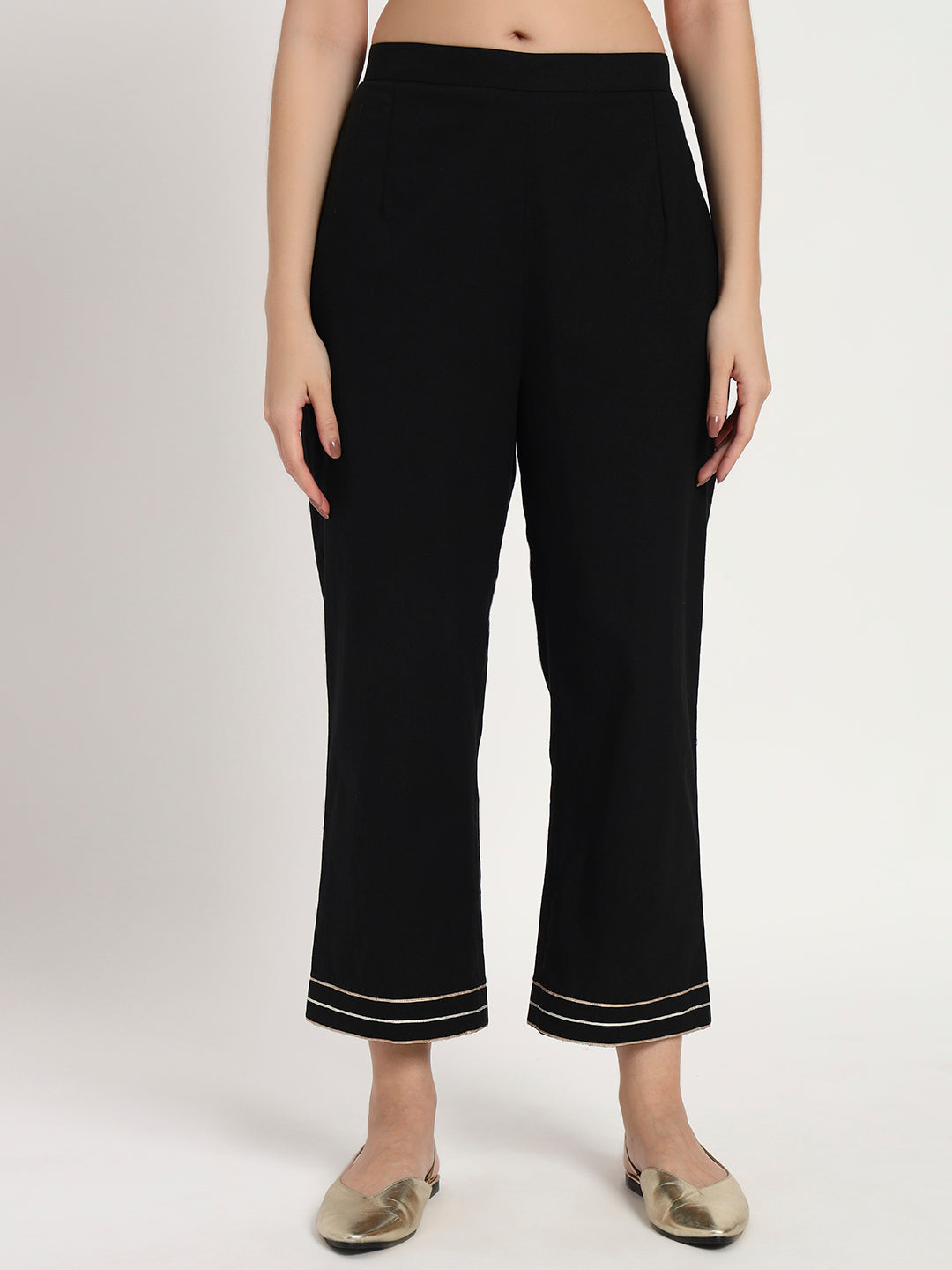 Elegant and modern, this black organic-cotton kurta set features concentric ripple stripes in contrast thread that contour the neckline, sleeves, and hem for a sculpted, flattering look. Paired with matching straight pants edged with the same border, it’s a sleek pick for festive evenings and refined daywear.