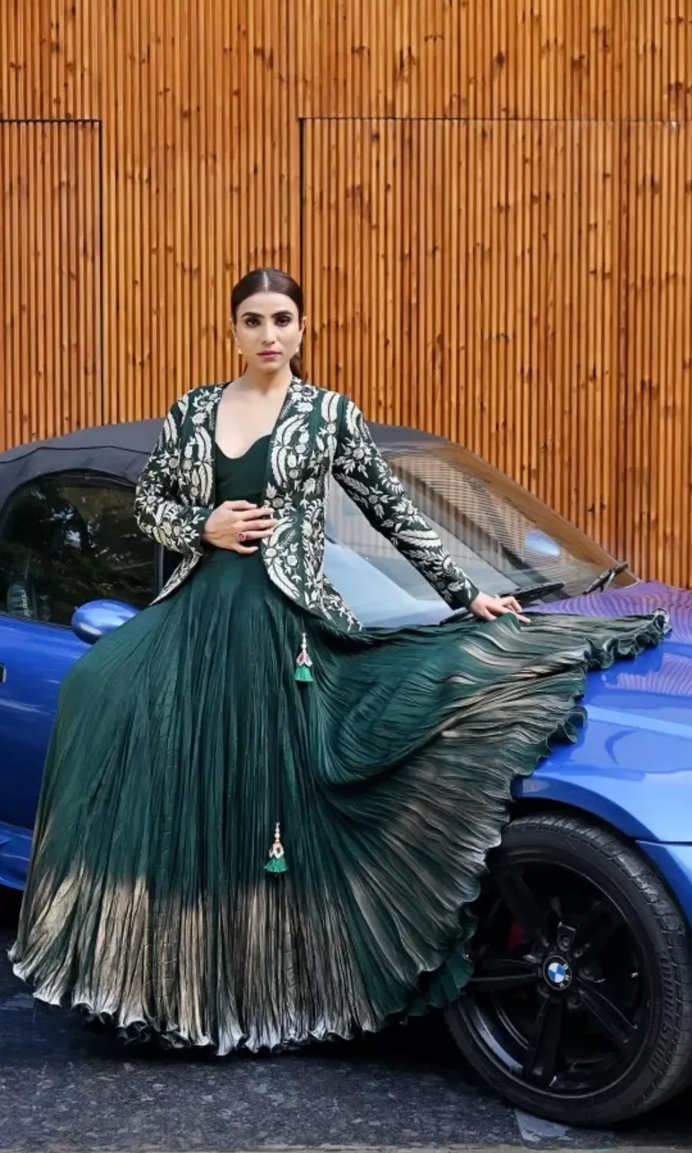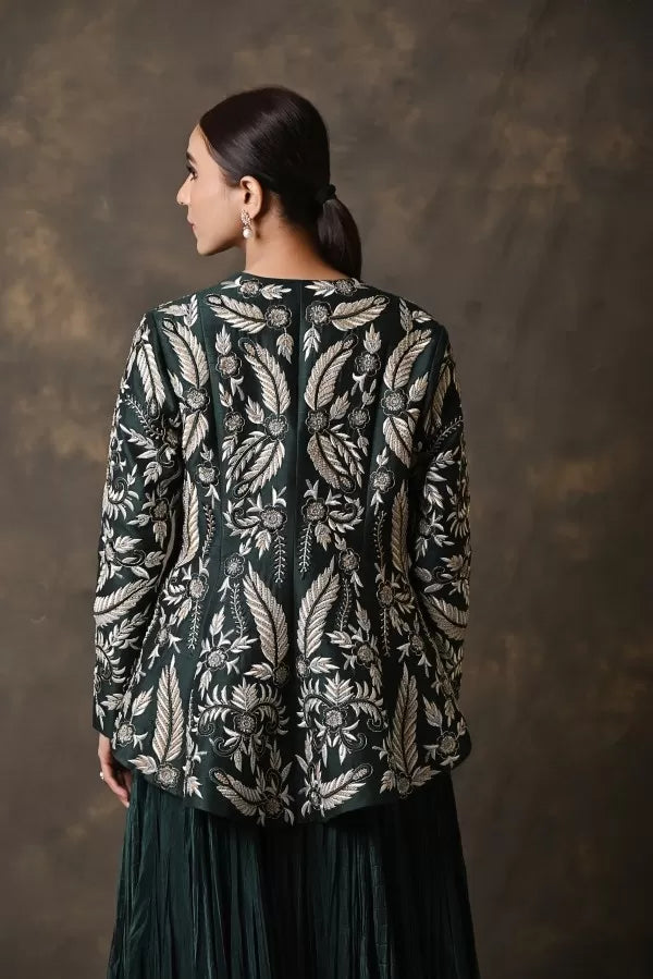 The Elegant Bottle Green Crushed Skirt Set with Embroidered Peplum Jacket is a celebration of timeless craftsmanship infused with modern sophistication—perfect for those who love to embrace heritage with a contemporary twist.