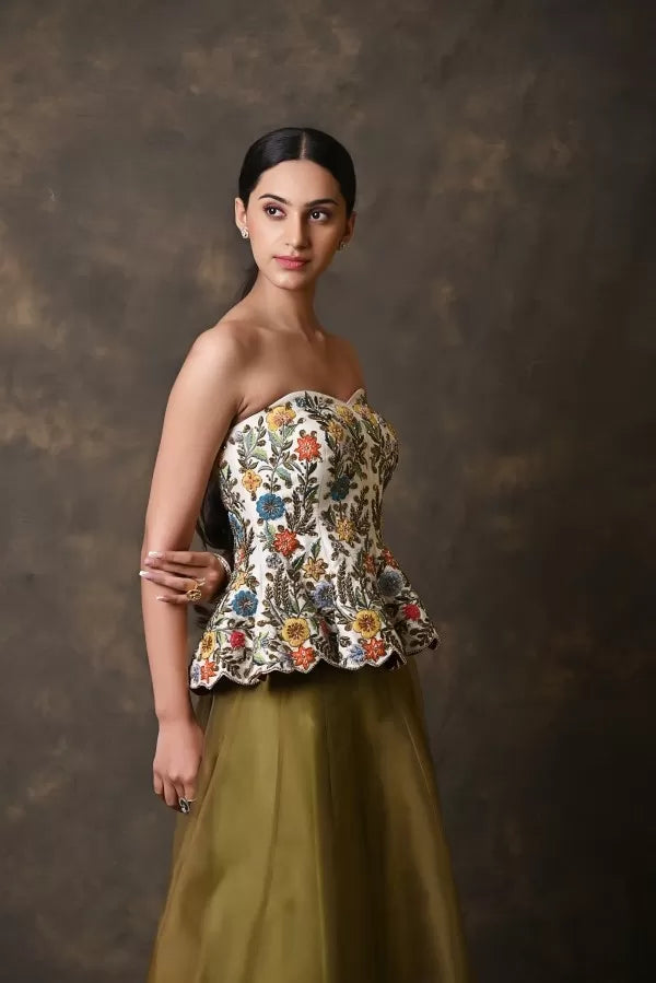 A masterpiece of artisanal work, the Ivory Gold Peplum Corset Set is the perfect choice for those who appreciate fine detailing and modern elegance wrapped in tradition
