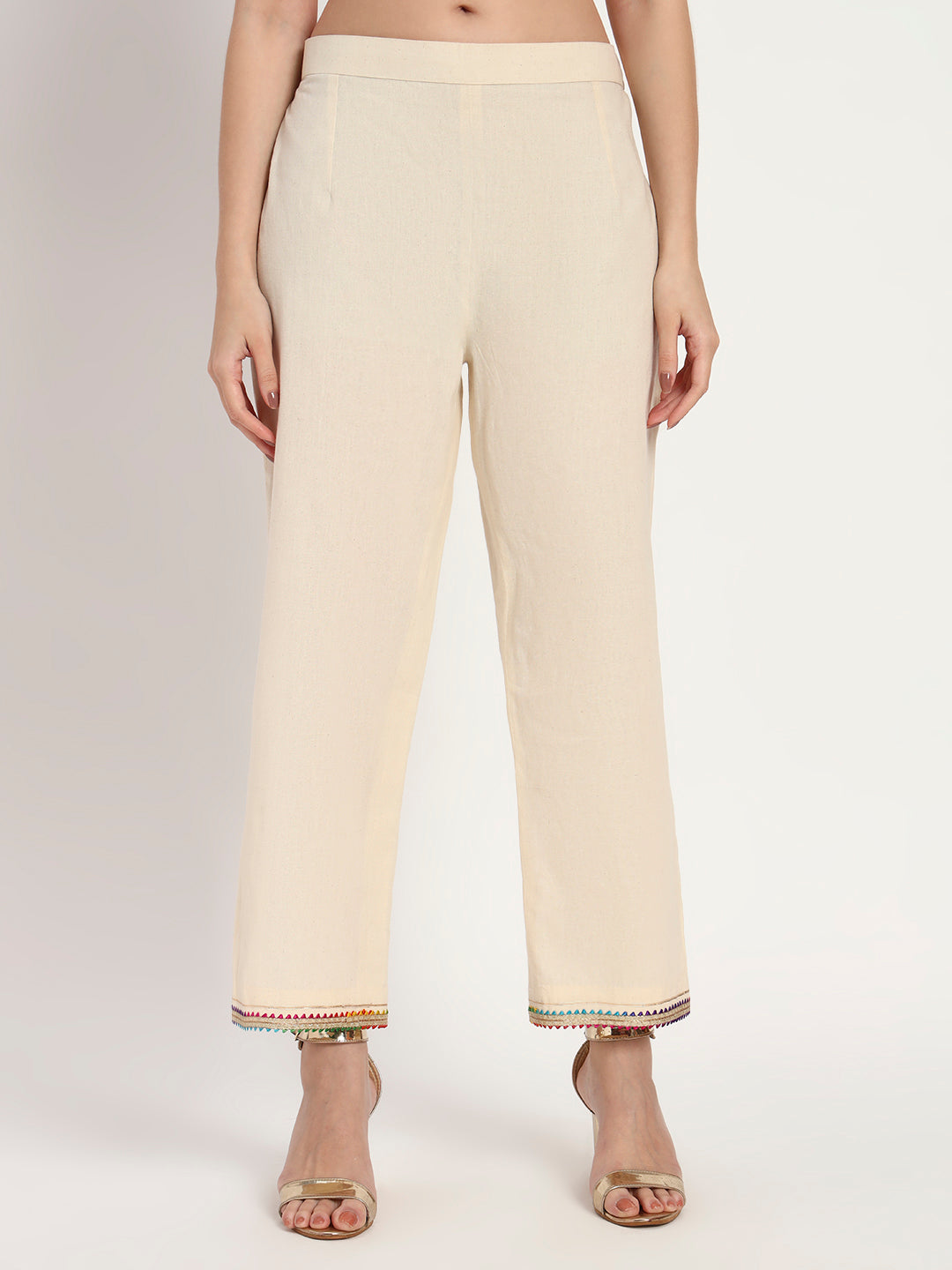 Elegant and easy to wear, this ivory organic-cotton set features a structured yoke with fine pintucks, a neat round neckline with a slit placket, and a softly pleated front that adds graceful movement. Finished with multicolour edge detailing and paired with coordinated straight pants, it’s perfect for daytime functions and refined evenings.