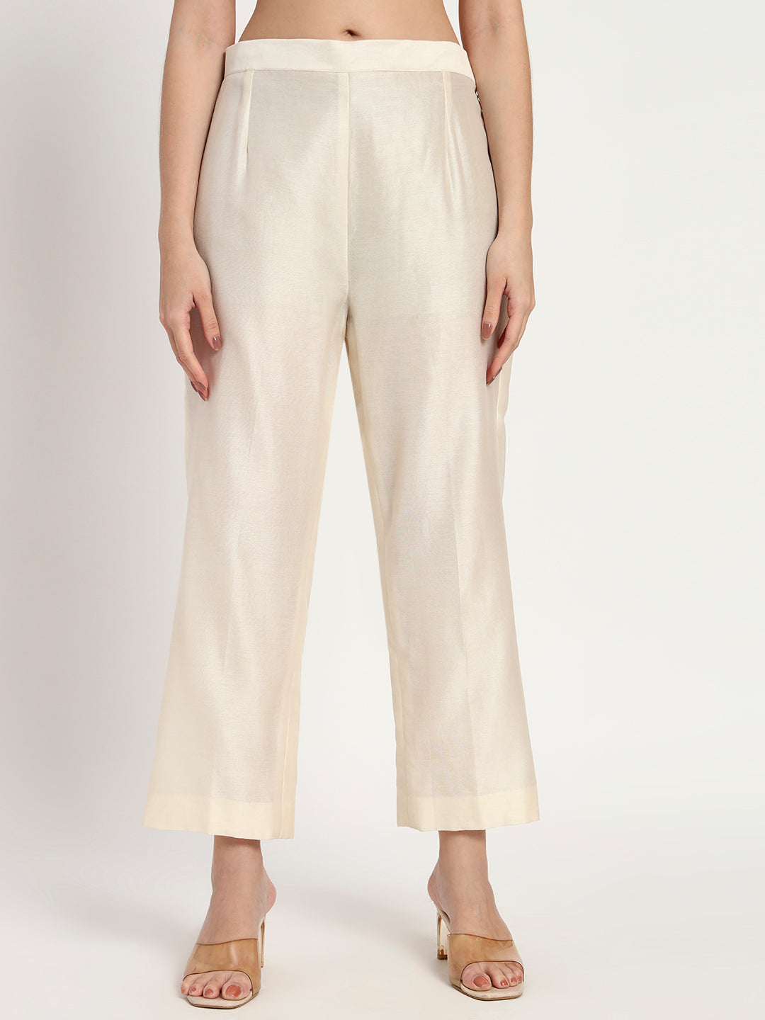 Luminous and refined, this ivory silk-chanderi set features delicate grey butis, a flattering V-notch neckline, and a softly flared asymmetric hem edged in striking red piping. Paired with straight ivory pants and a sheer dupatta finished with the same contrast border, it’s an elegant pick for poojas, festive lunches, and evening celebrations.