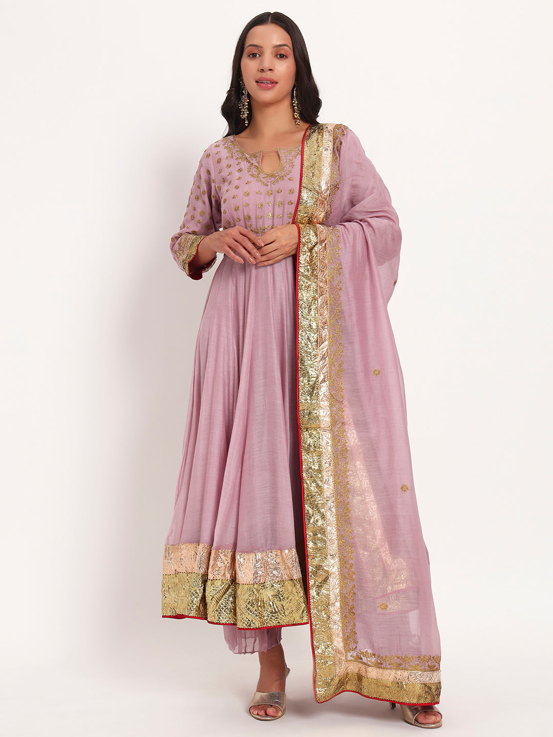 The Lilac Gleam Mal Chanderi Anarkali Set is a vision of refined grace and regal allure, blending traditional artistry with soft contemporary elegance. Crafted from luxurious mal chanderi fabric, the ensemble flows effortlessly, radiating a subtle sheen that enhances its feminine silhouette. The lilac anarkali, adorned with intricate lampi gotta and delicate aari work, embodies meticulous craftsmanship that celebrates timeless Indian embroidery. The fitted yoke and flared panels create a flattering drape, while the matching lower maintains comfort and fluidity. Completing the look is a coordinated dupatta, beautifully edged with golden lampi gotta and a hint of red piping, adding depth and festive vibrance to the pastel palette.
