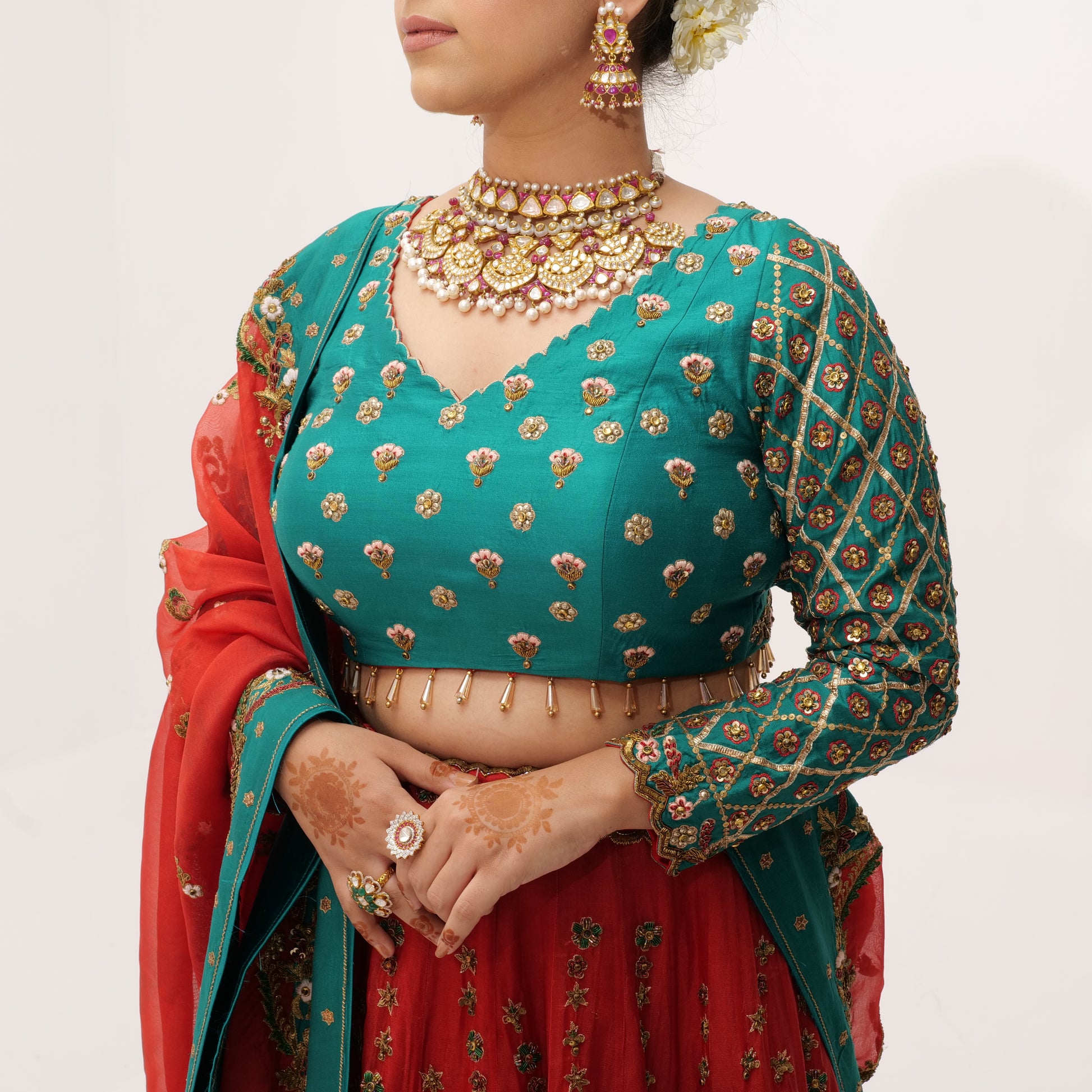 - All-Over Metal Handwork – Intricate embellishments on lehenga, blouse & dupatta