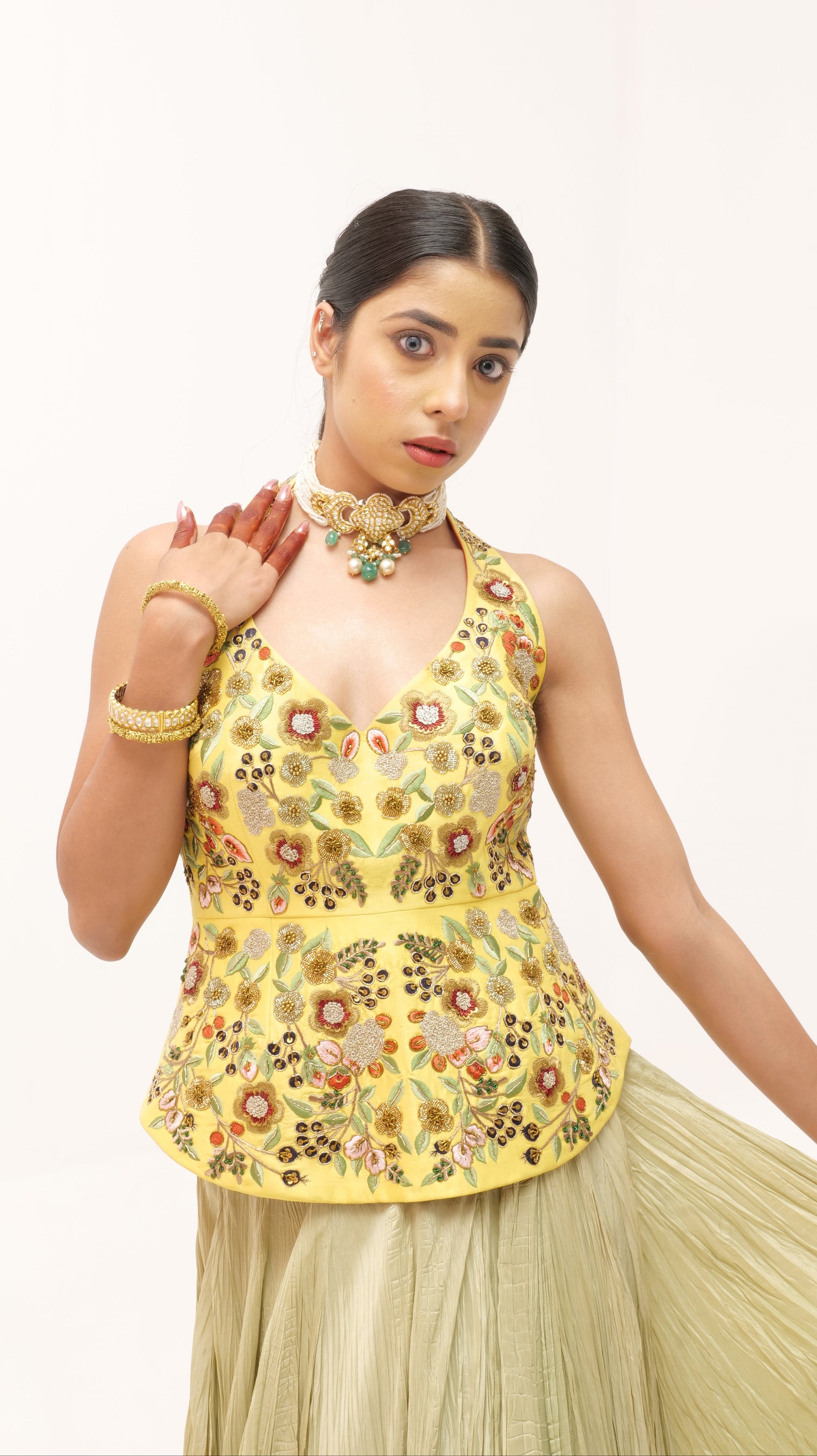 Raw Silk Halter Corset with Handwork and Crushed Opara Skirt