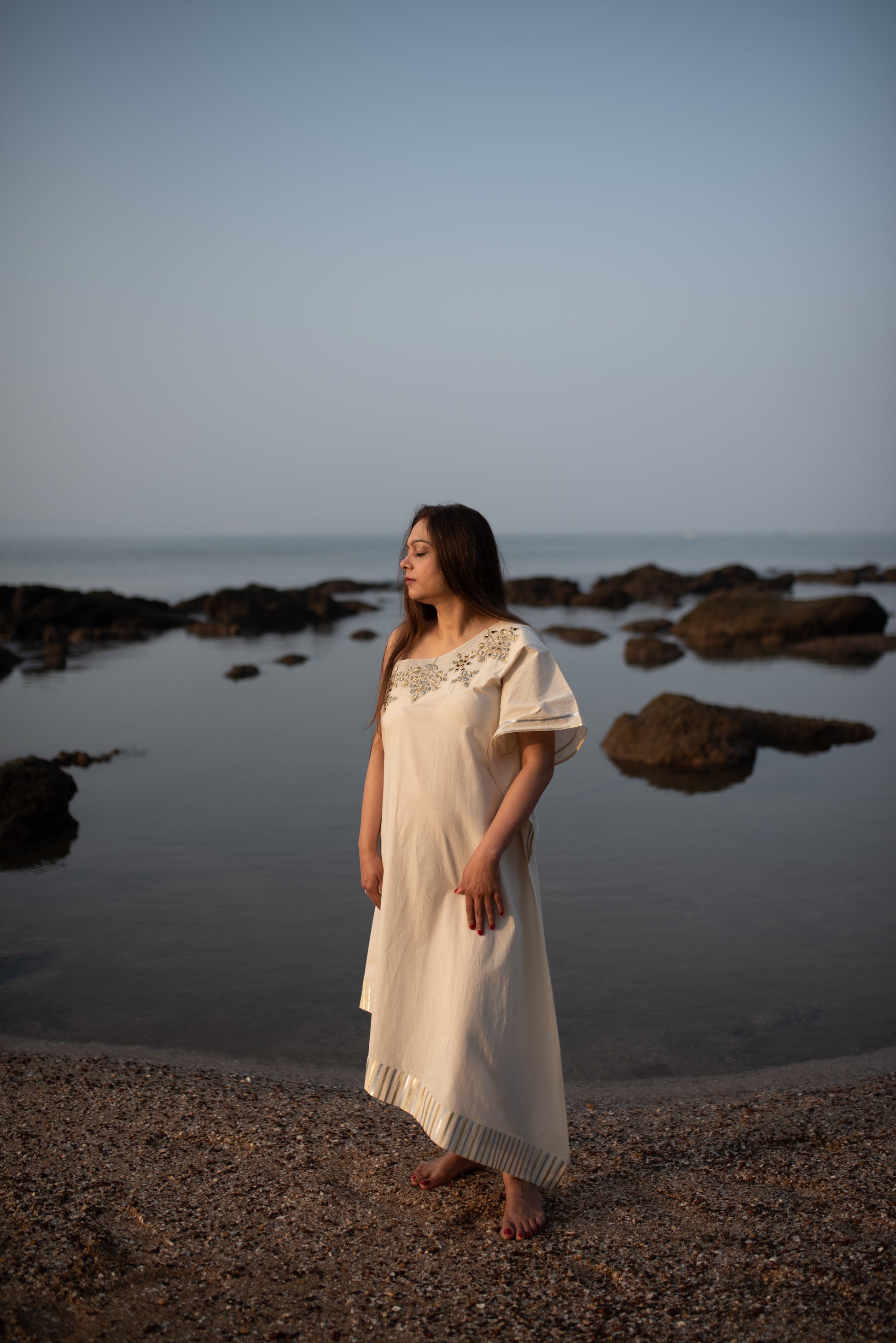 The asymmetrical silhouette, accentuated by delicate gold-striped detailing along the hemline, exudes a sense of modern minimalism. A single-shoulder layered sleeve adds a distinctive touch, enhancing the dress’s unique charm. Hand-embroidered floral motifs in muted gold tones grace the neckline, creating a subtle yet striking embellishment that speaks to artisanal craftsmanship.