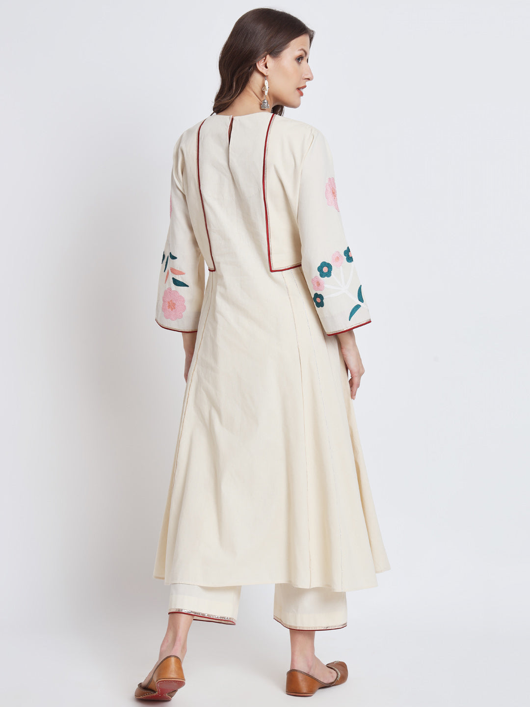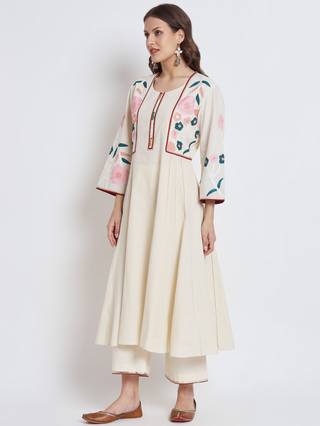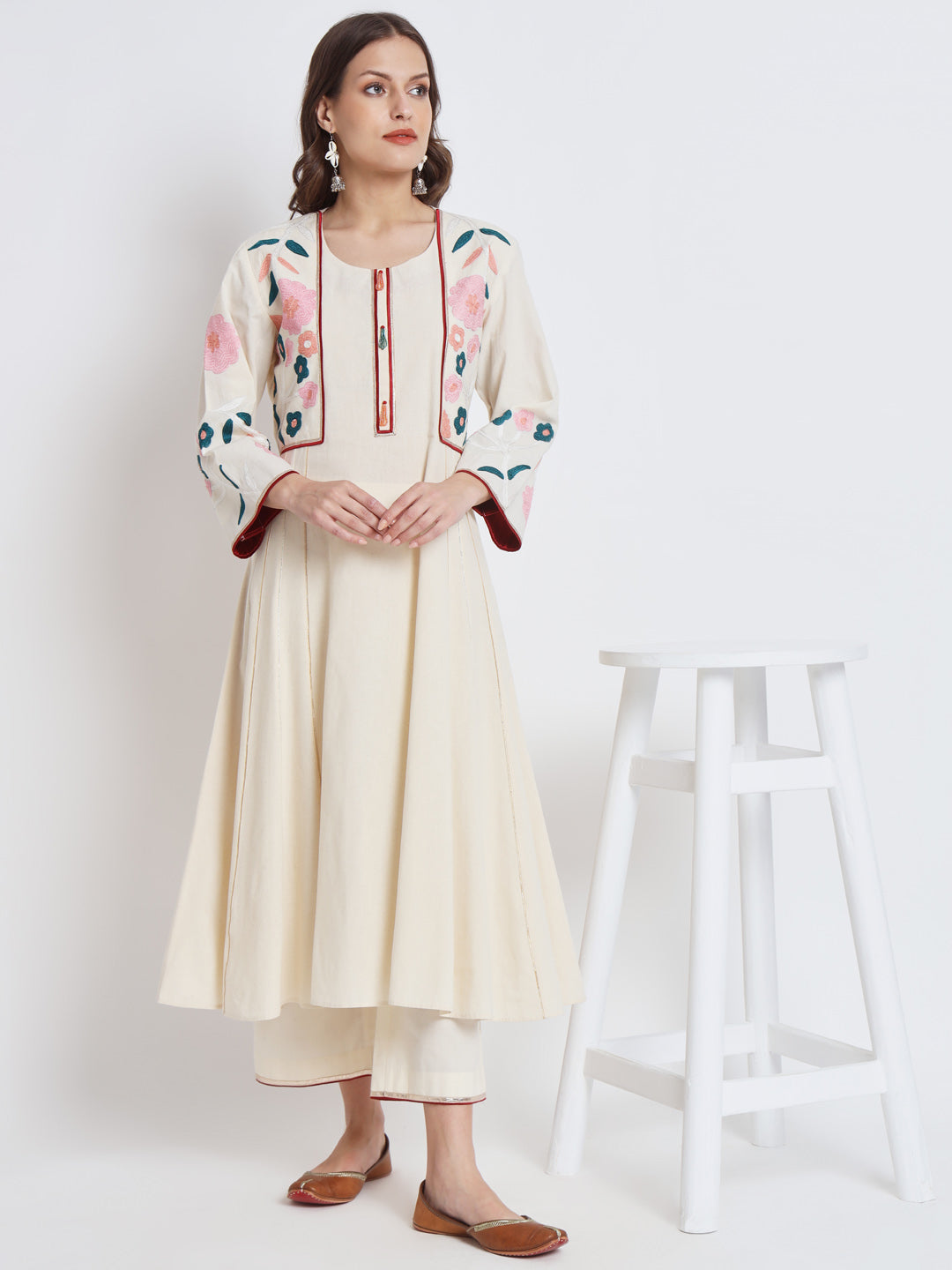 The flared A-line kurta is paired with straight pants and a cropped jacket adorned with delicate floral embroidery in soft pink and green hues. The contrast piping and detailing add structure and charm, making it a perfect pick for brunches, intimate gatherings, or festive daywear.